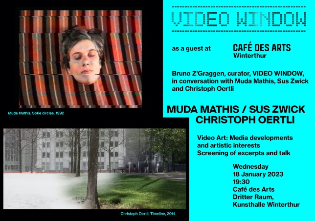 The curator Bruno Z’Graggen joins the artist duo Muda Mathis / Sus Zwick and the video artist Christoph Oertli from Basel to discuss subjects ranging from technological advances in the medium of video to artistic interests and strategies. The event will seek to reflect, clearly and vividly, upon the characteristics of video art while also offering insights into the artistic processes of the guests, whose pioneering influence upon artistic production in Switzerland stretches back over more than 30 years.