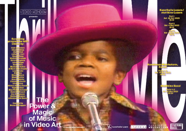 The video art platform VIDEO WINDOW will be staying as a guest in Lucerne, Zurich and Basel in October and November 2023. In cooperation with Kunsthalle Luzern, stattkino Luzern, Kunstraum Walcheturm and Stadtkino Basel, it presents Thrill Me. The Power & Magic of Music in Video Art, an international screening programme with three parts and one video each by 23 well-known positions, twelve from Switzerland and eleven from abroad. The fascinating multifaceted programme sheds light on the fundamental importance of music in video art and shows an exciting arc with works from the 1990s to the present. The screenings take place in the presence of some of the artists, in Lucerne followed by artists' talks.